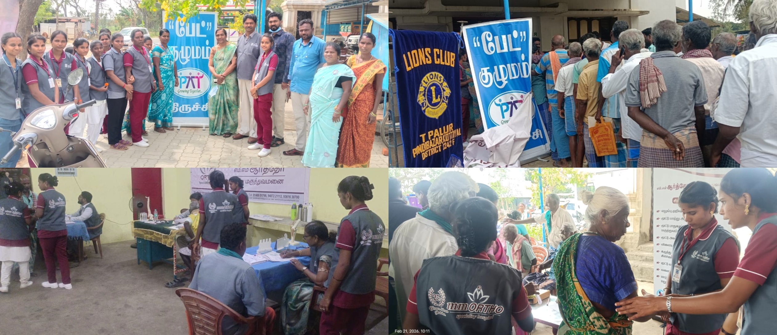 The Paandi Bazaar Kottiyal Lions Club (District 324F), in association with PAT Group, Trichy, and Inba Traders, Naduvalur, in collaboration with M.M. Ortho Special Hospital, Kumbakonam, organized a free orthopaedic medical camp on 21 February 2026 (Saturday) from 9:30 AM to 1:30 PM at G.R. Thirumana Mandapam, Paandi Bazaar. Expert consultation and non-surgical treatments were provided for various bone-related conditions, including bone degeneration, bone weakness, joint wear and tear, and pain in the hip, hands, legs, and joints. Around 285 people benefited from the camp